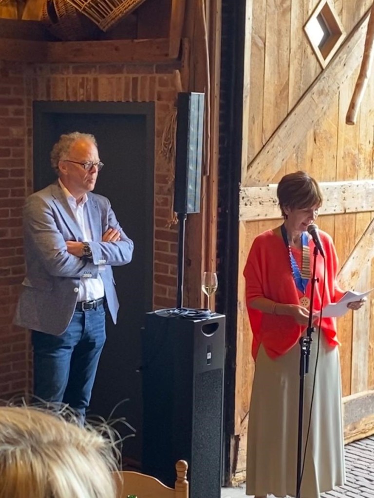Op de linkerfoto de aftredende voorzitter, Caroline Vonck en links de nieuwe voorzitter Henk Hoftijzer. Op de rechterfoto Frank Brakenhoff, die een prachtig stuk in elkaar heeft gezet en smakelijk verhaalt in dichtvorm over de aankomend en scheidend voorzitter.